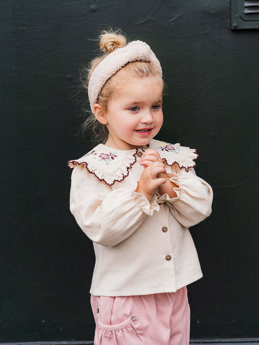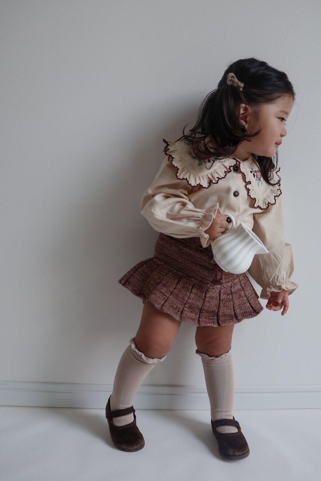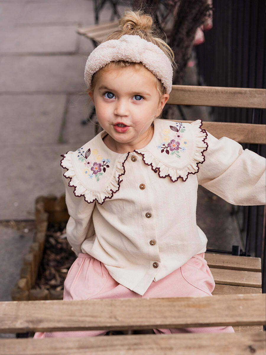 大きめの襟にあしらわれた繊細な刺繍が目を惹く一着。