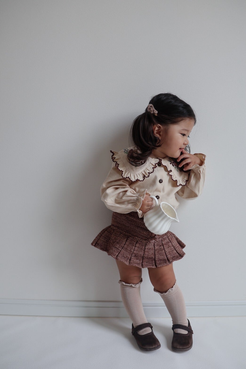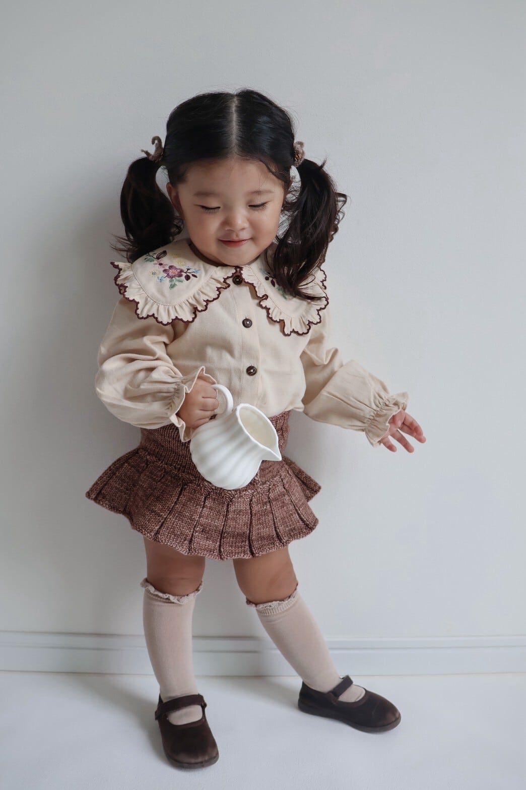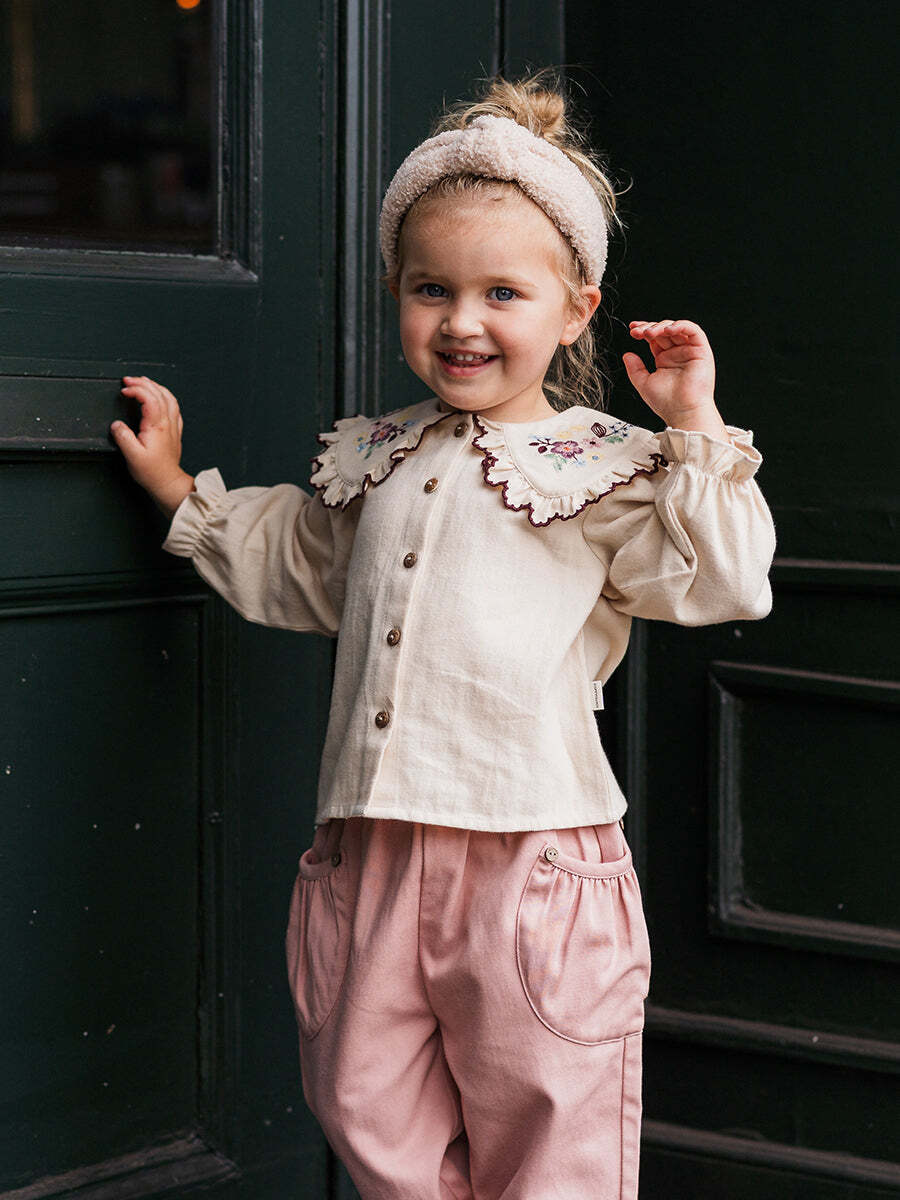 大きめの襟にあしらわれた繊細な刺繍が目を惹く一着。