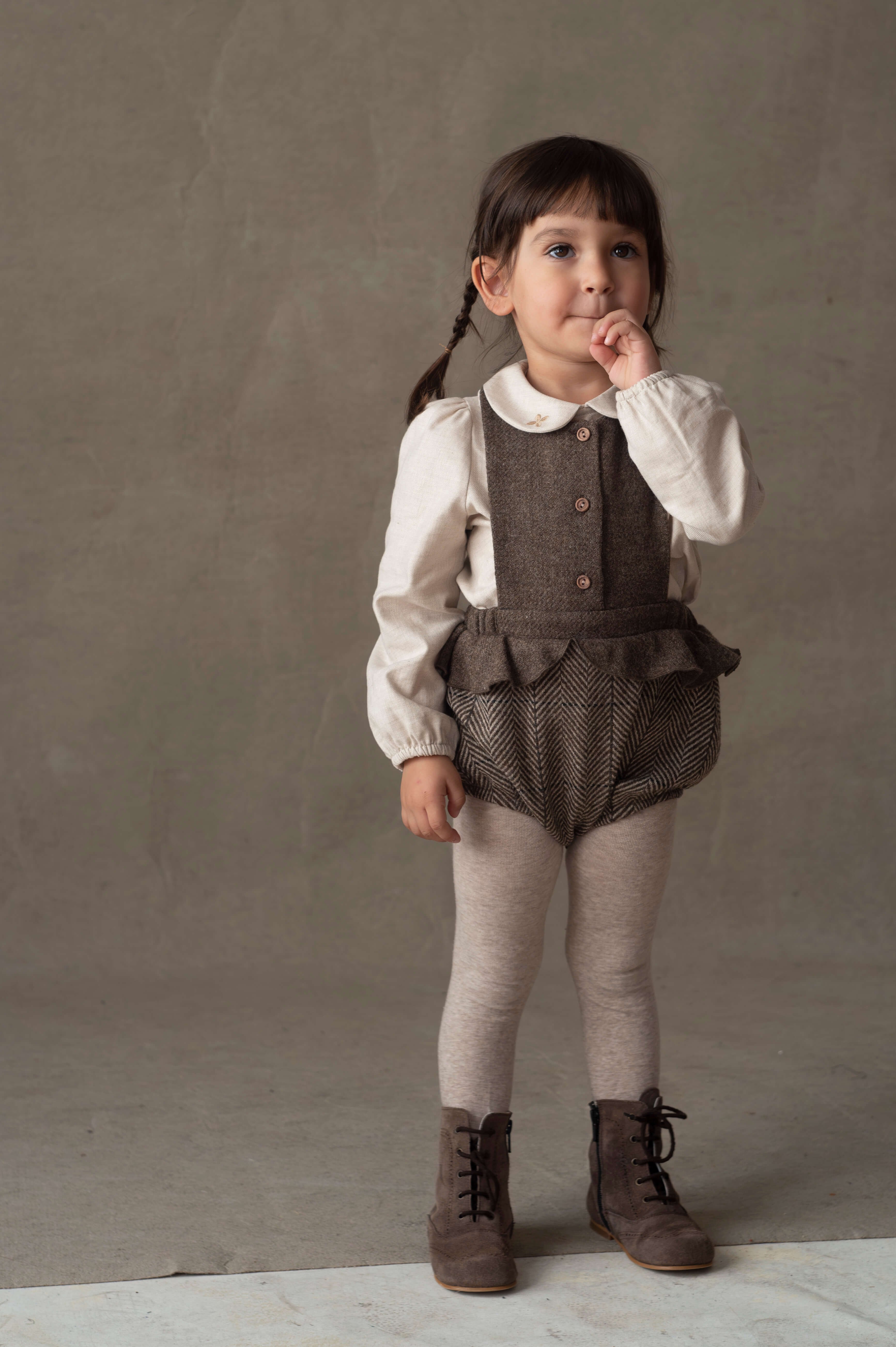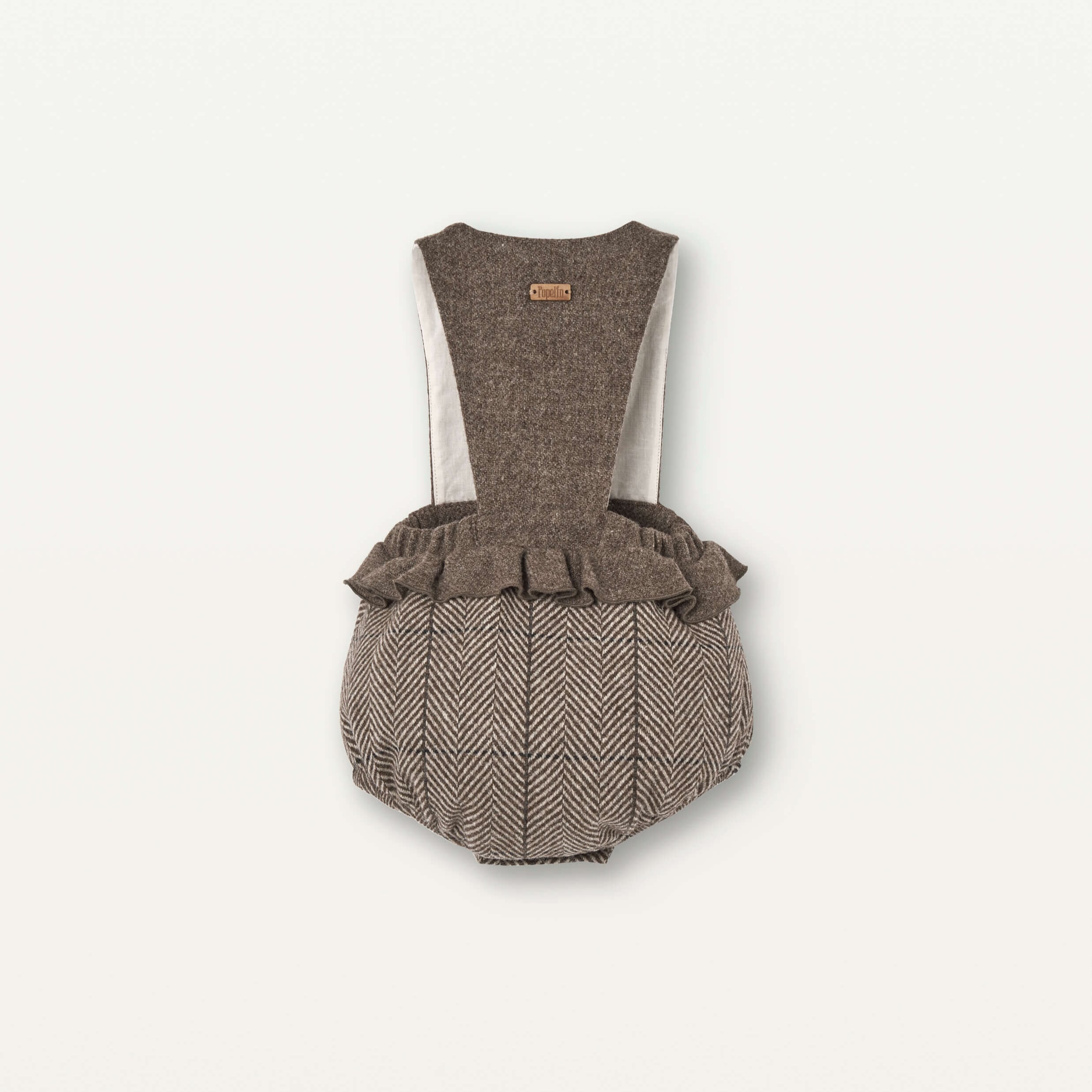 腰回りのフリルデザインが愛らしく落ち着いたブラウンカラーは性別を問わず着用できます。
