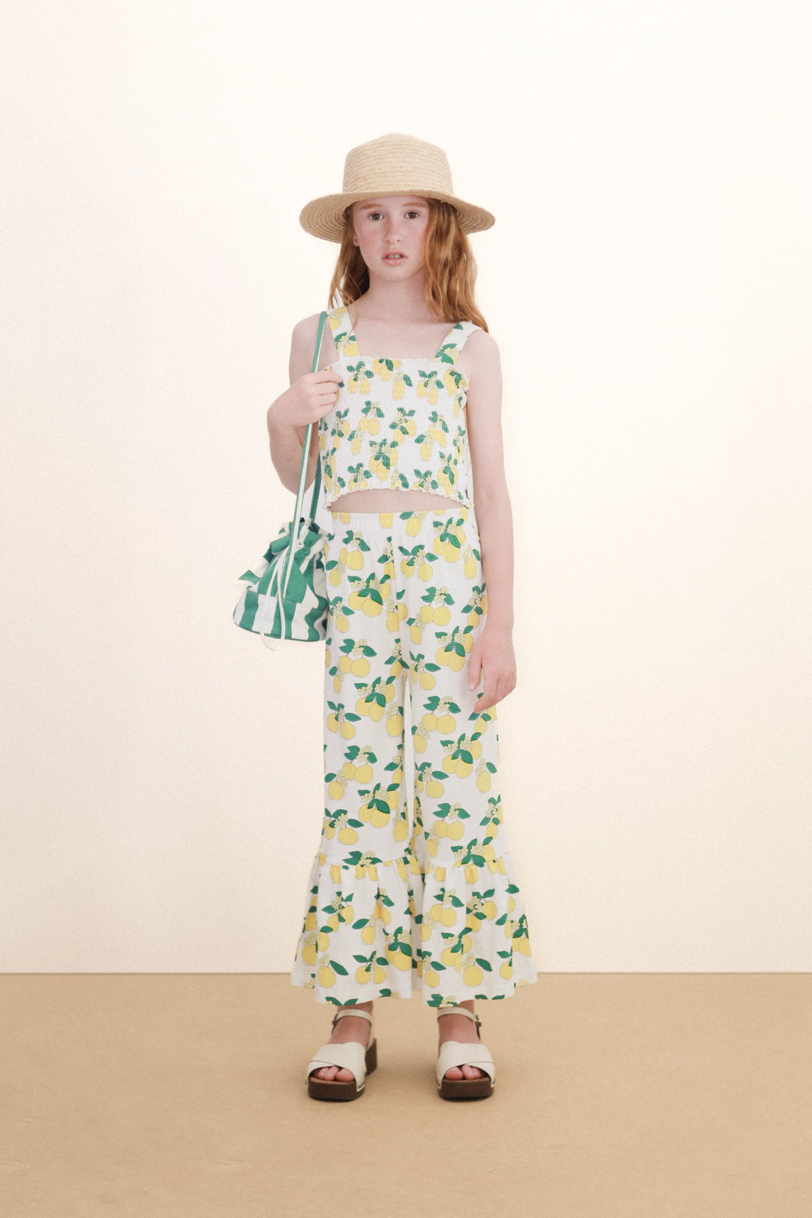 鮮やかなオレンジ柄が目を惹く、TINYCOTTONSらしい遊び心あふれるパンツ。