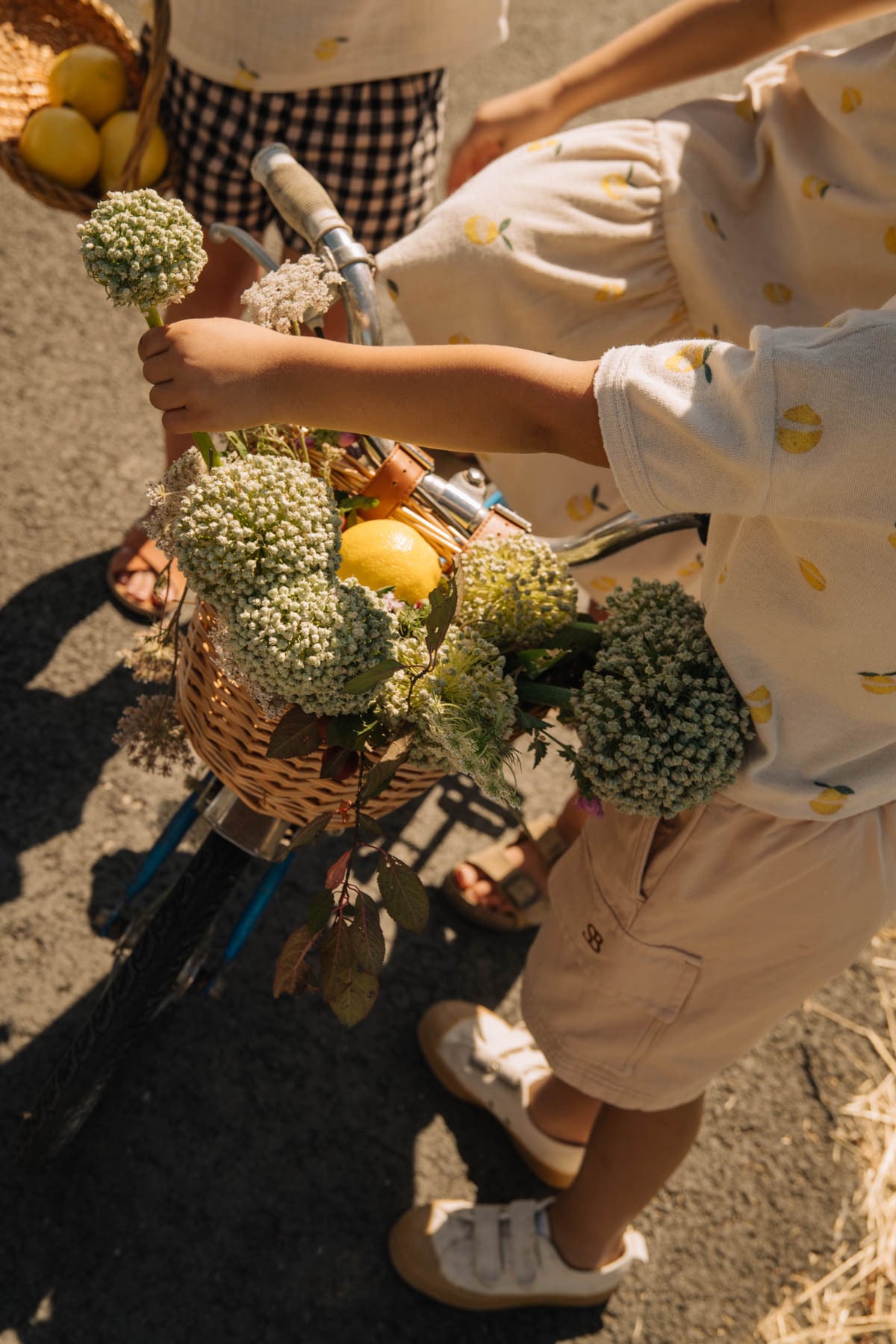ナチュラルなサンドカラーに、爽やかなレモン柄を散りばめたテリーシャツ。