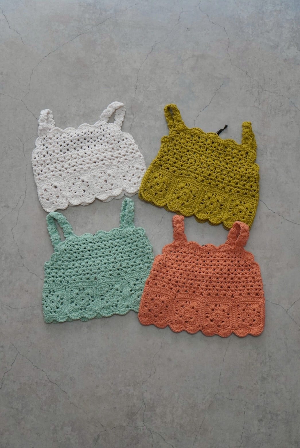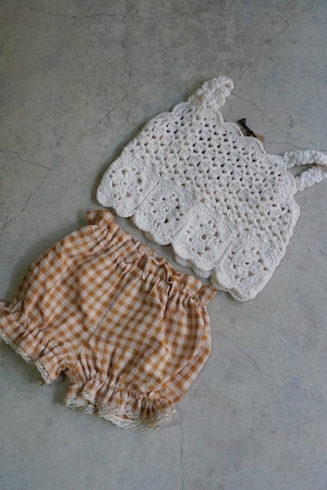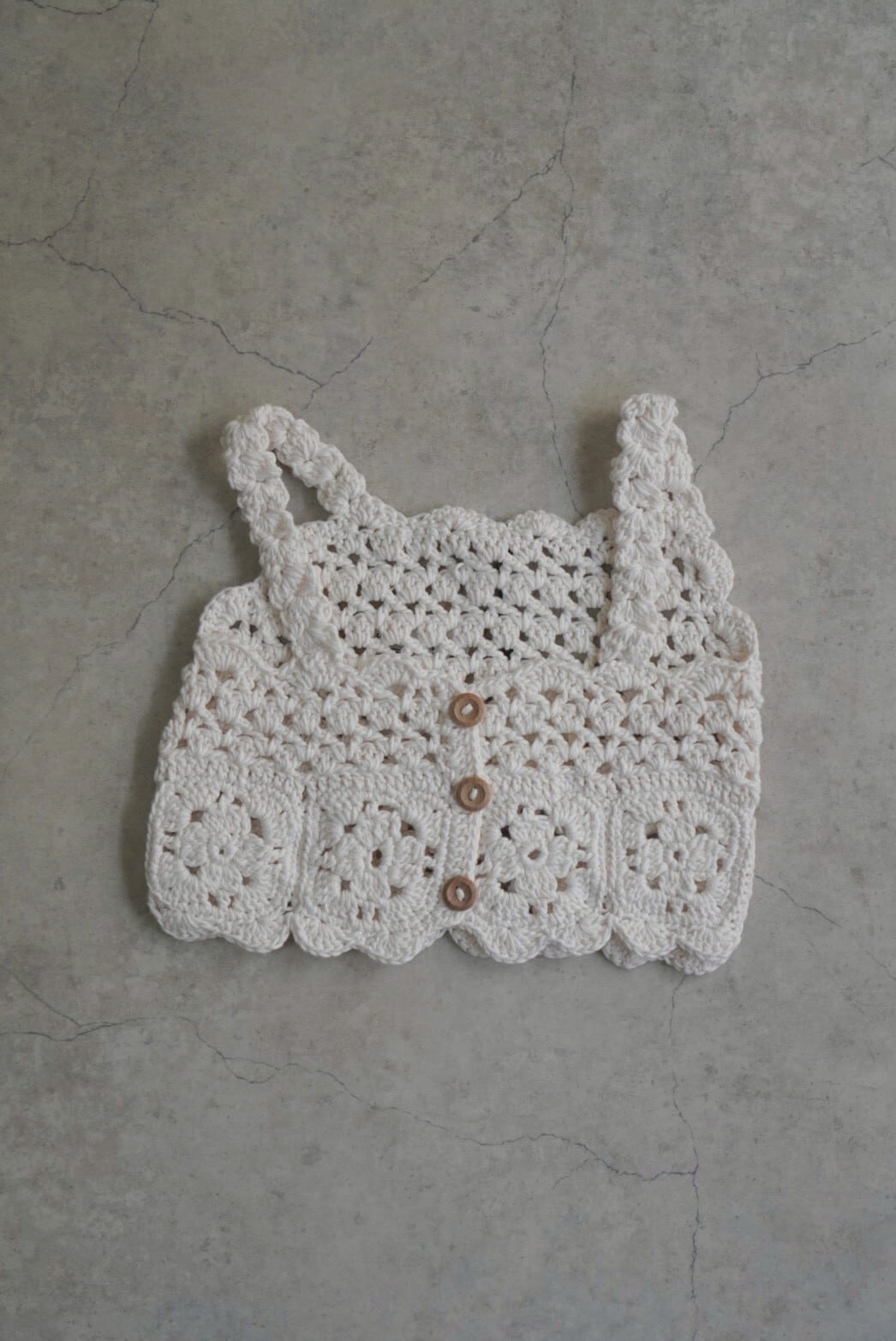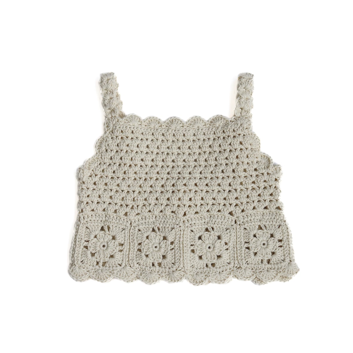 繊細なかぎ編みで仕立てられた、ハンドメイドの温もりを感じるトップス。