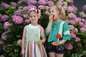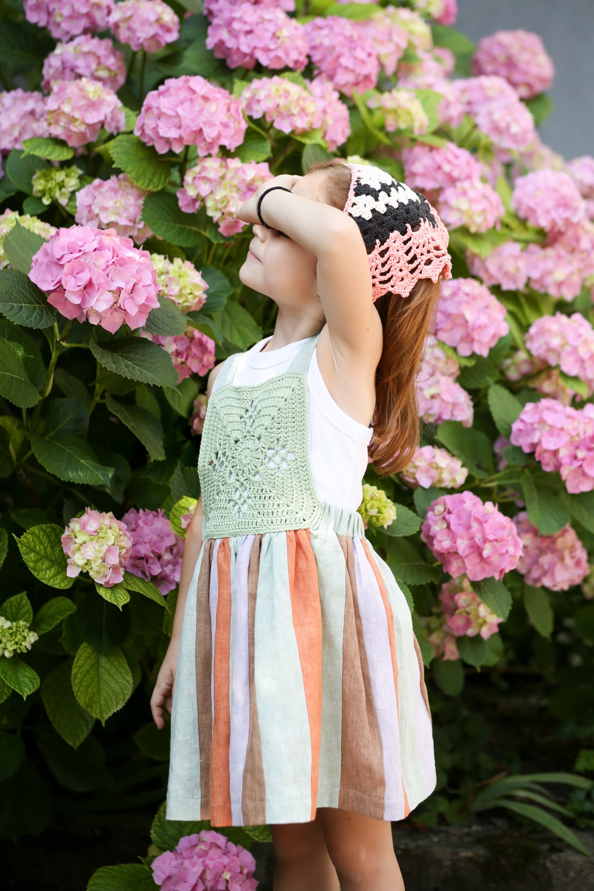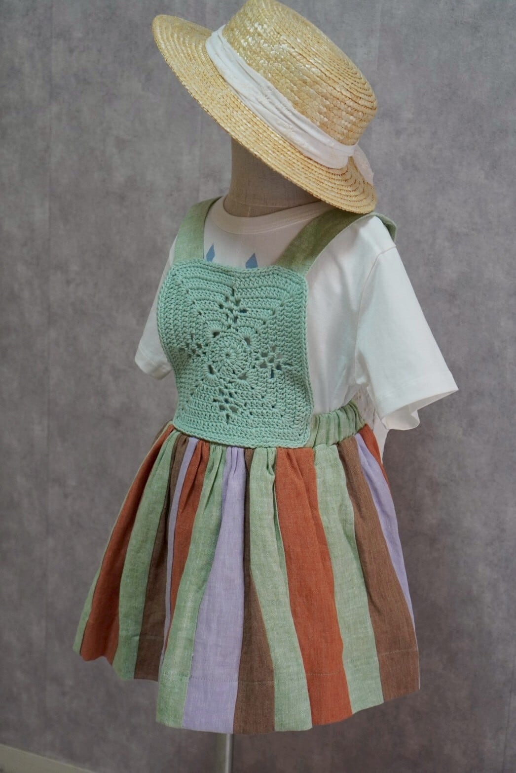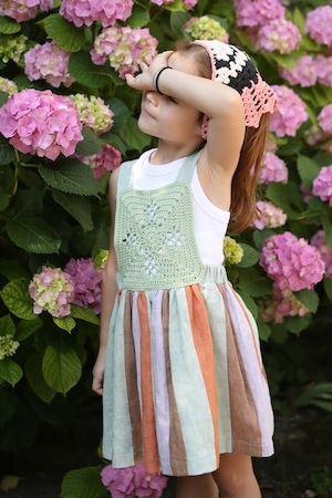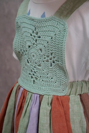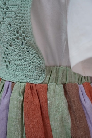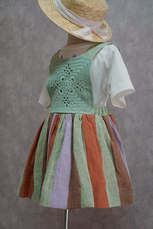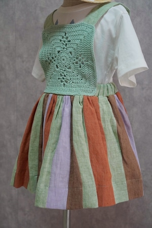 かぎ編みのトップとカラフルなスカートを組み合わせた、特別感のあるワンピース。