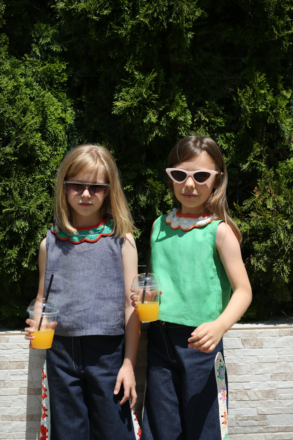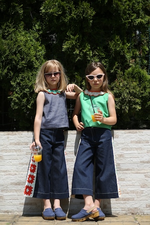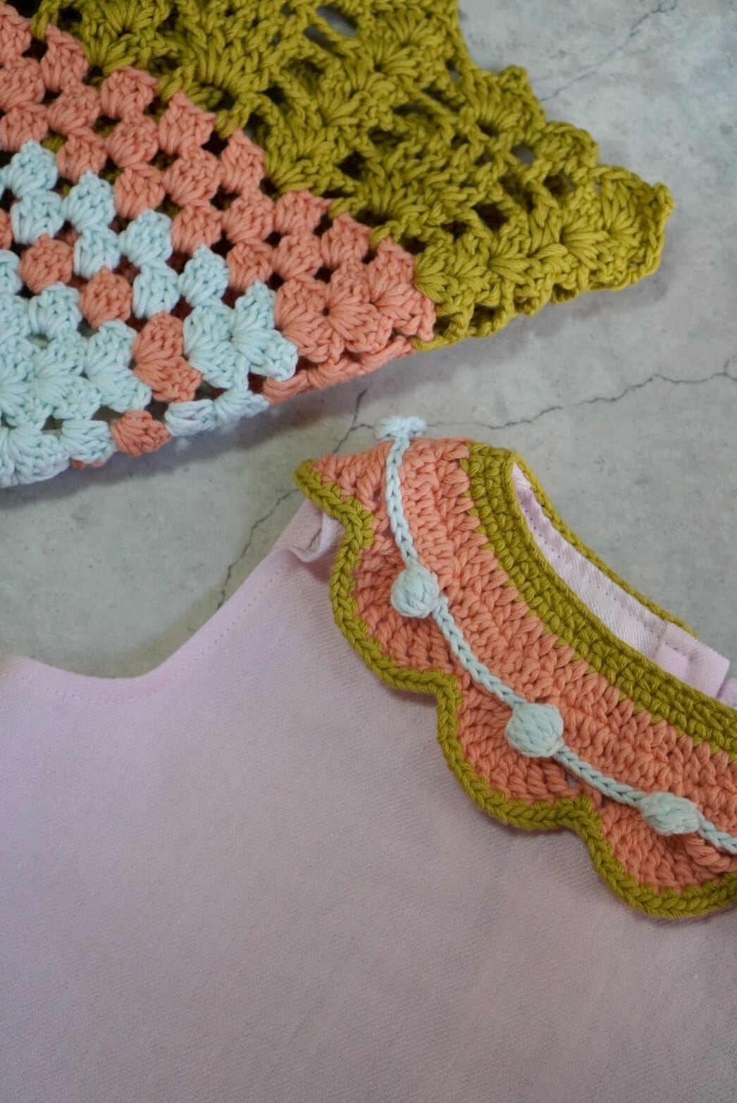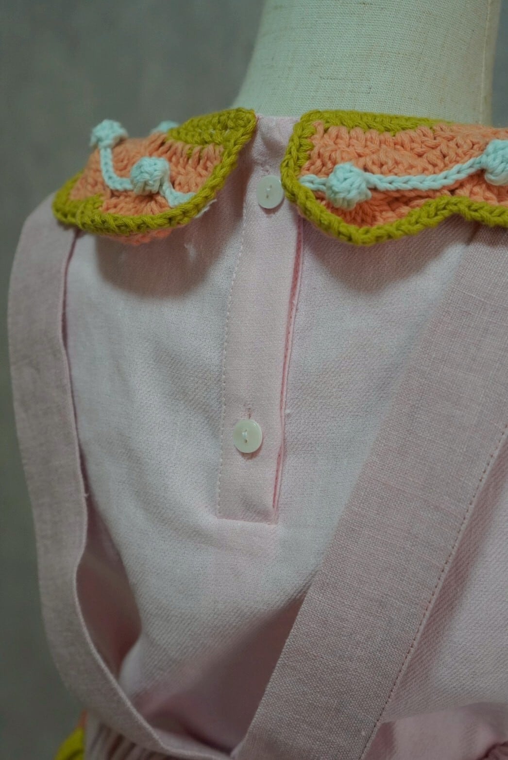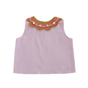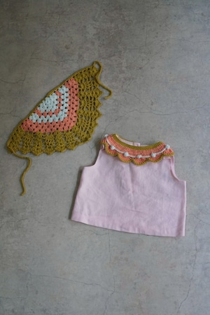 やさしいピンクカラーに、手編みの襟がアクセントになったトップス。