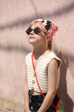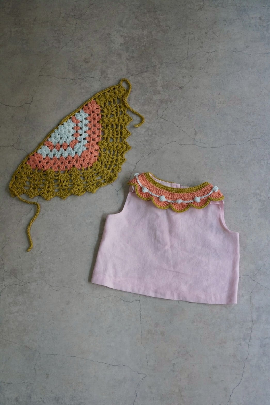 繊細なかぎ編みで仕立てられた、ハンドメイドの温もりを感じるスカーフ。