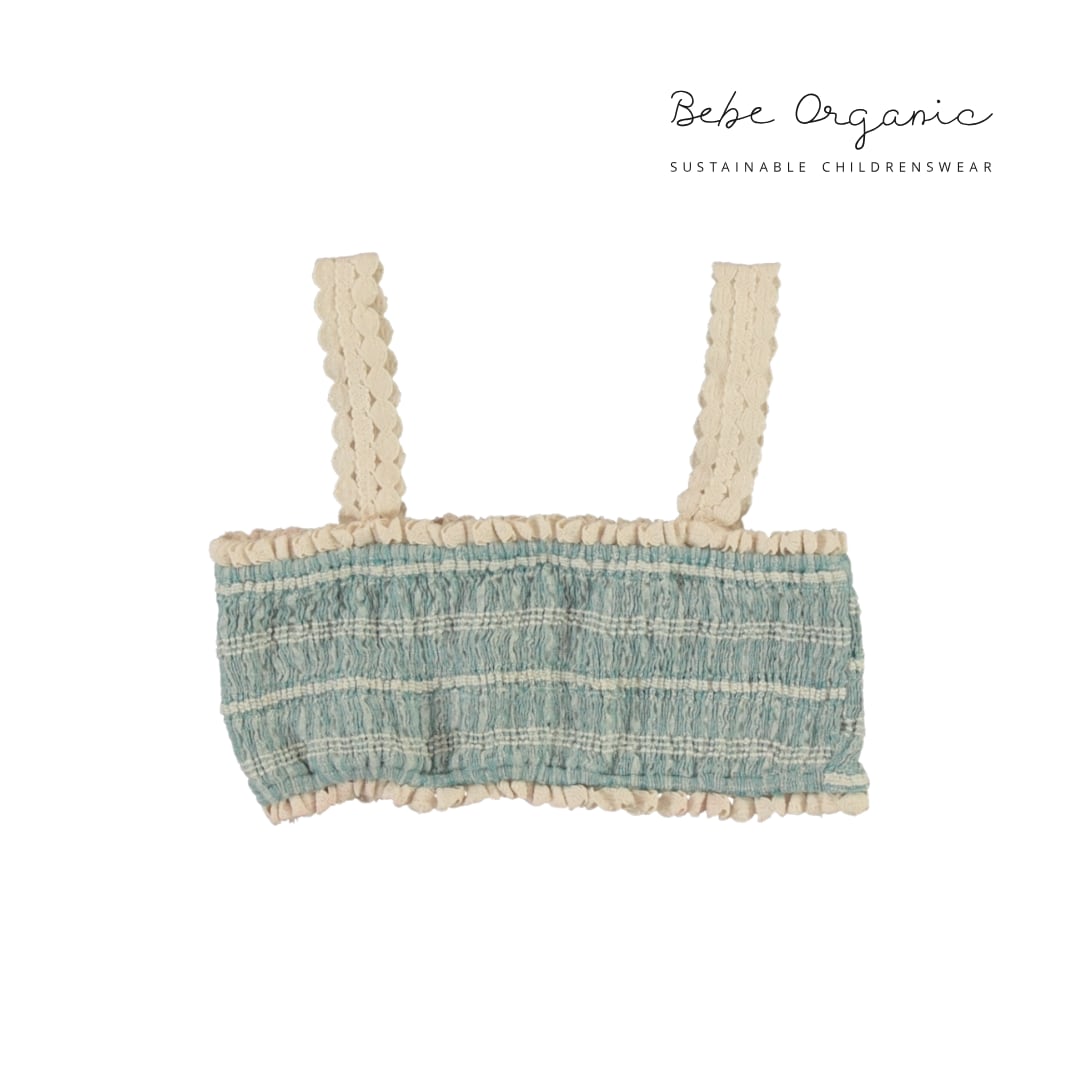ナチュラルなブルーグリーンに、クリームカラーのストラップとフリルの縁取りがアクセントに。