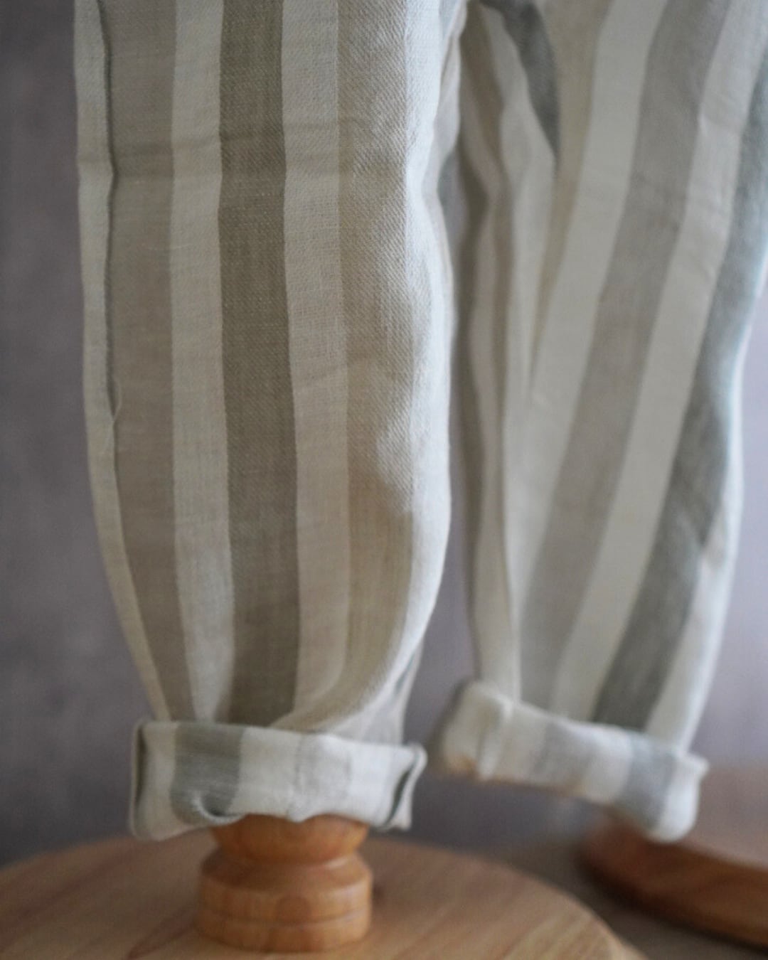 ナチュラルな配色のストライプが目を惹くパンツ。