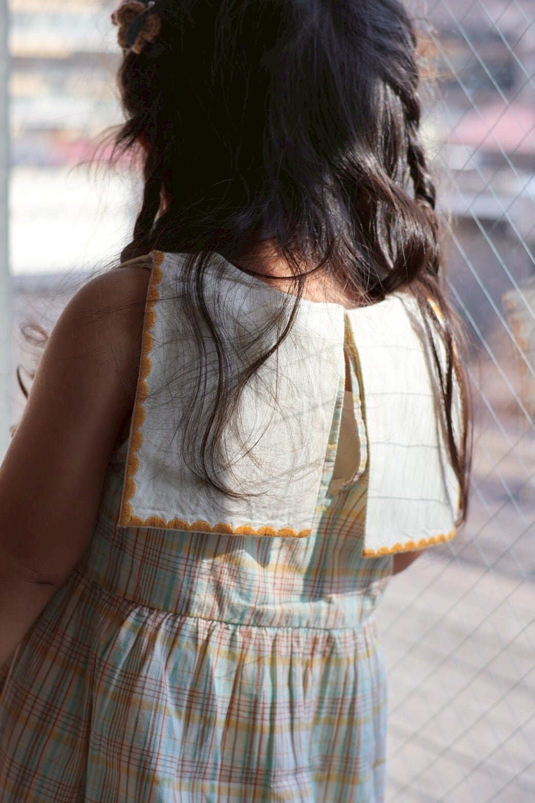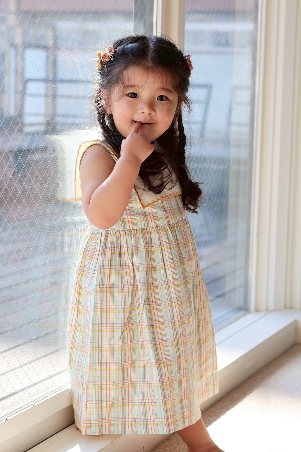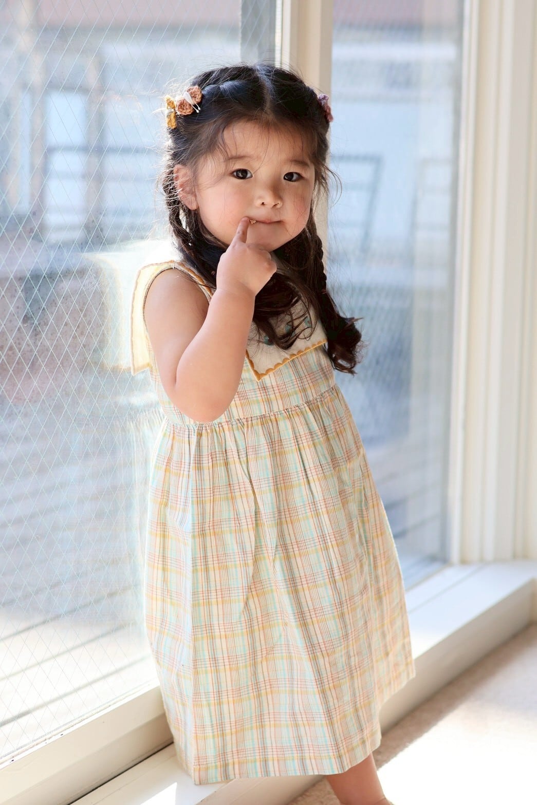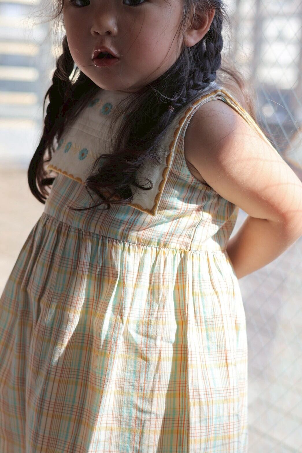 やわらかなカラーのチェックに、胸元の小さなお花刺繍が愛らしいワンピース。