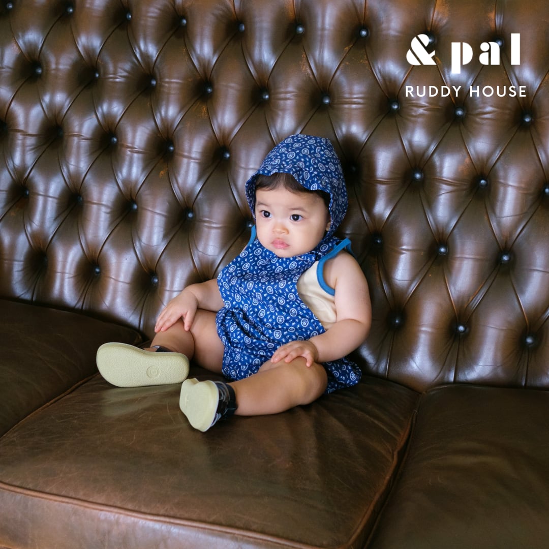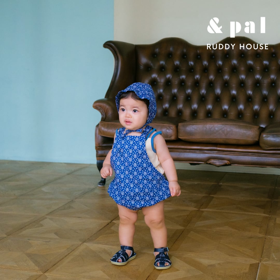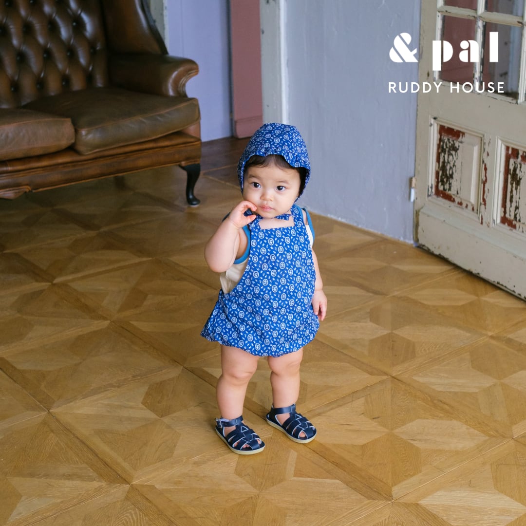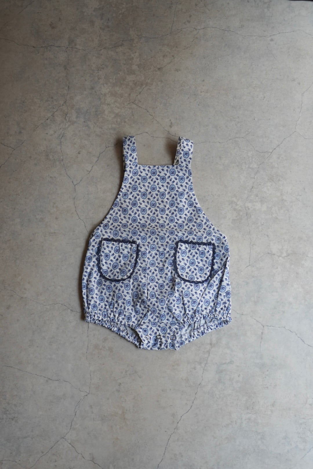 繊細なブルーの小花柄が印象的な、ロンパース。