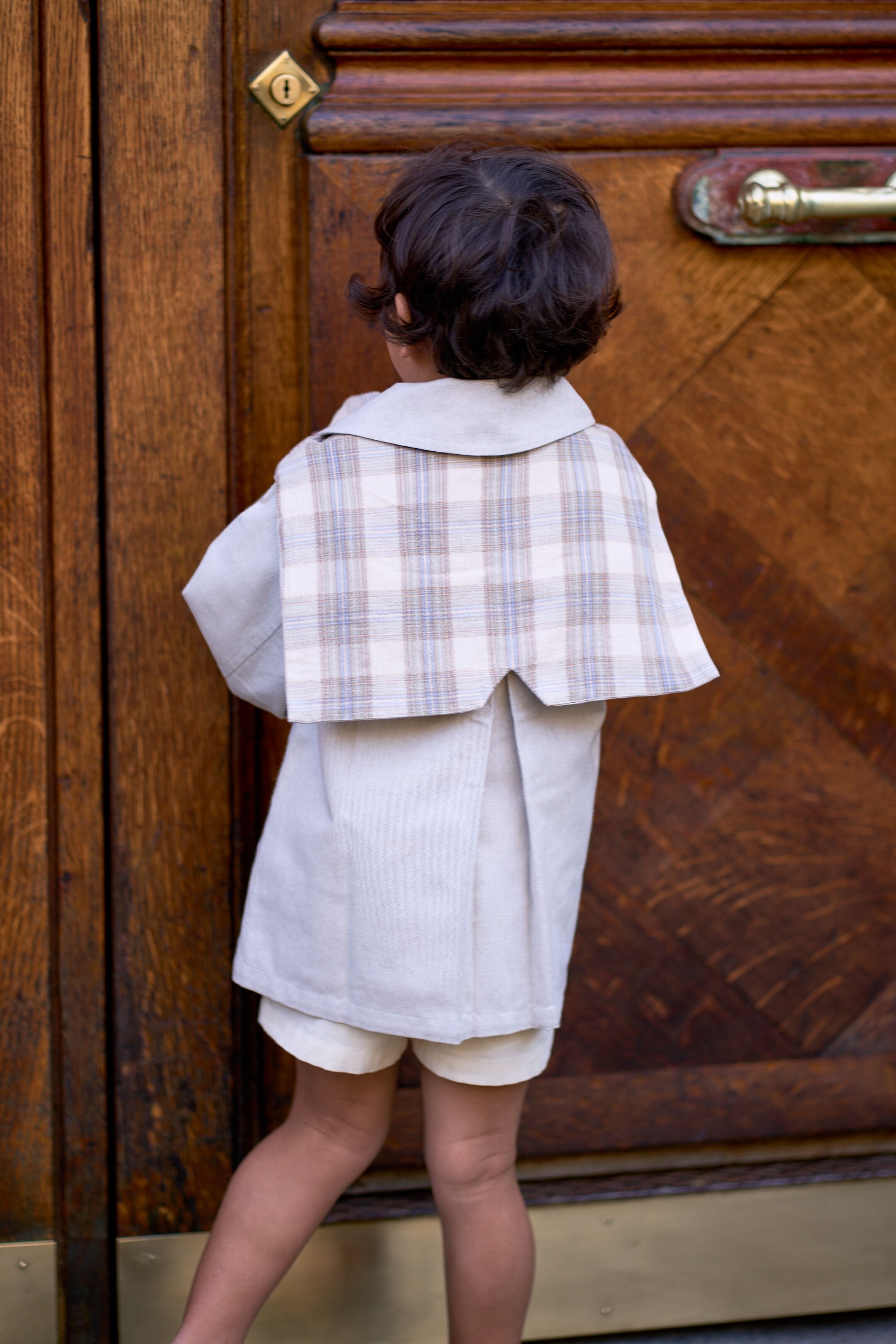 優しいベージュのチェックが目を引くショート丈のジャケット。