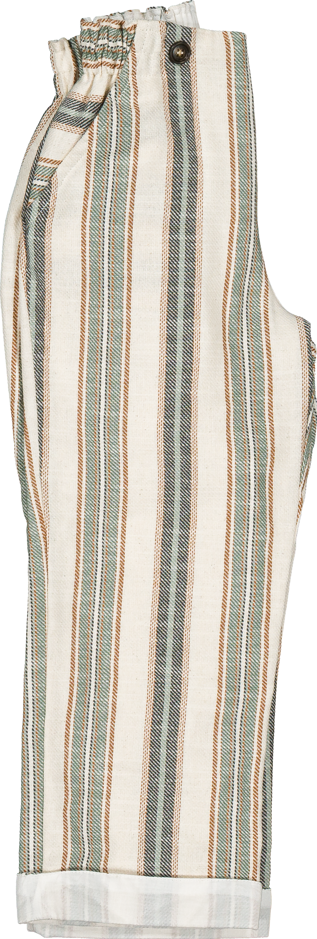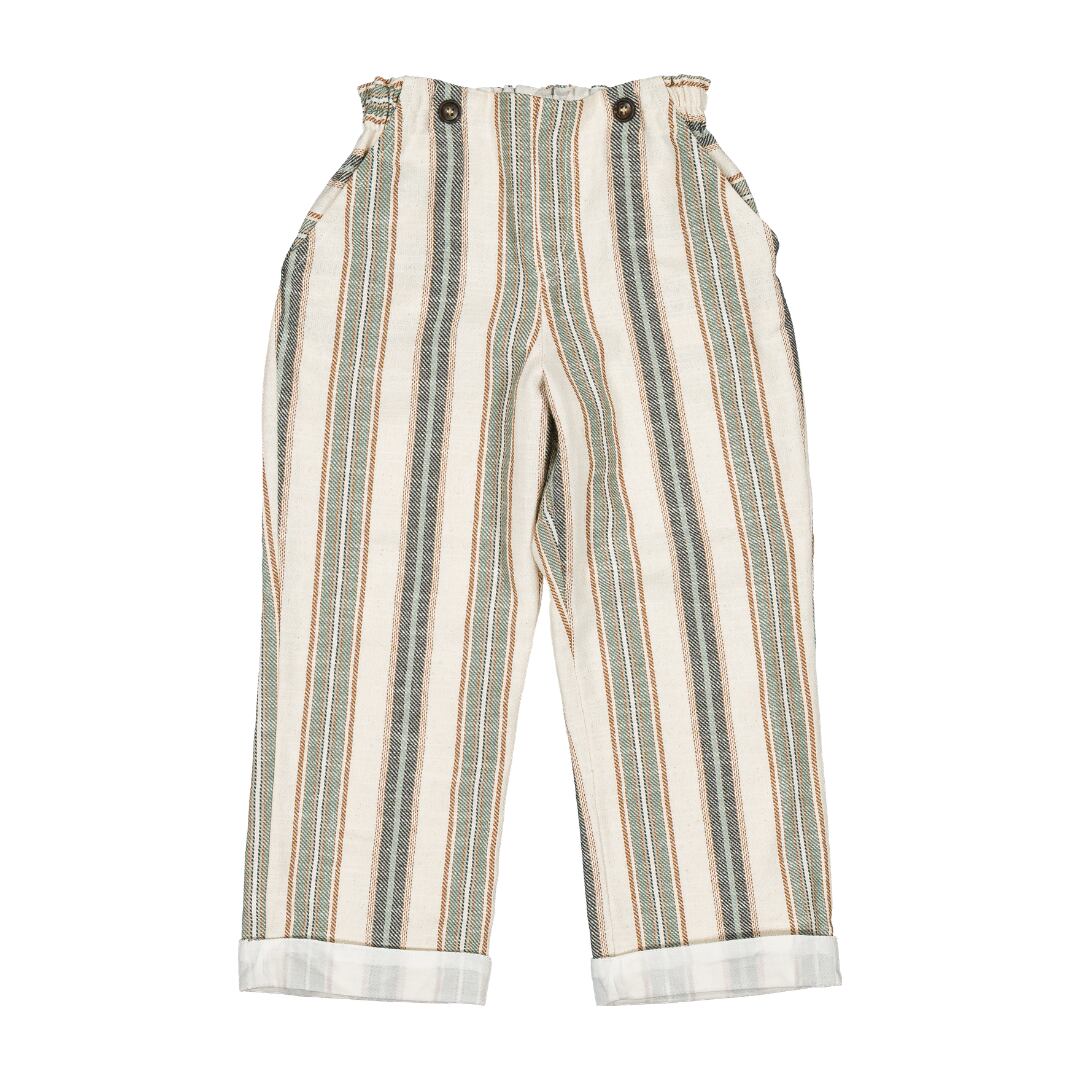 ナチュラルな風合いに、落ち着いたマルチストライプが映えるパンツ。