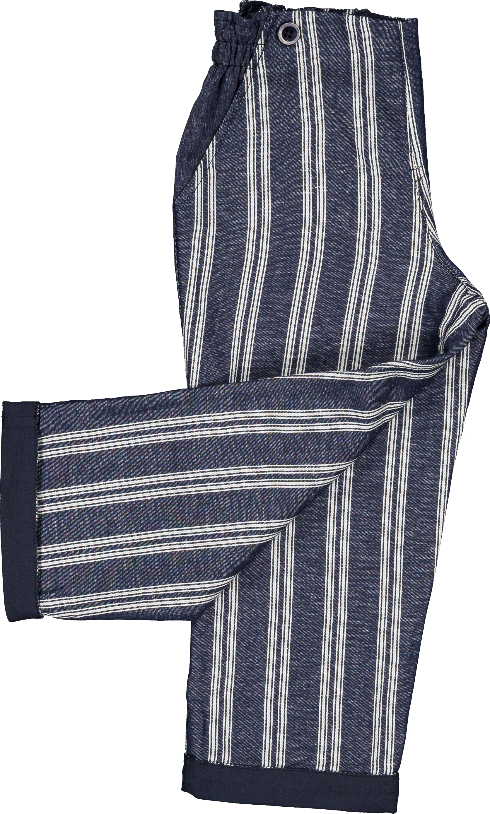 深みのあるネイビーに、繊細なストライプが映えるパンツ。