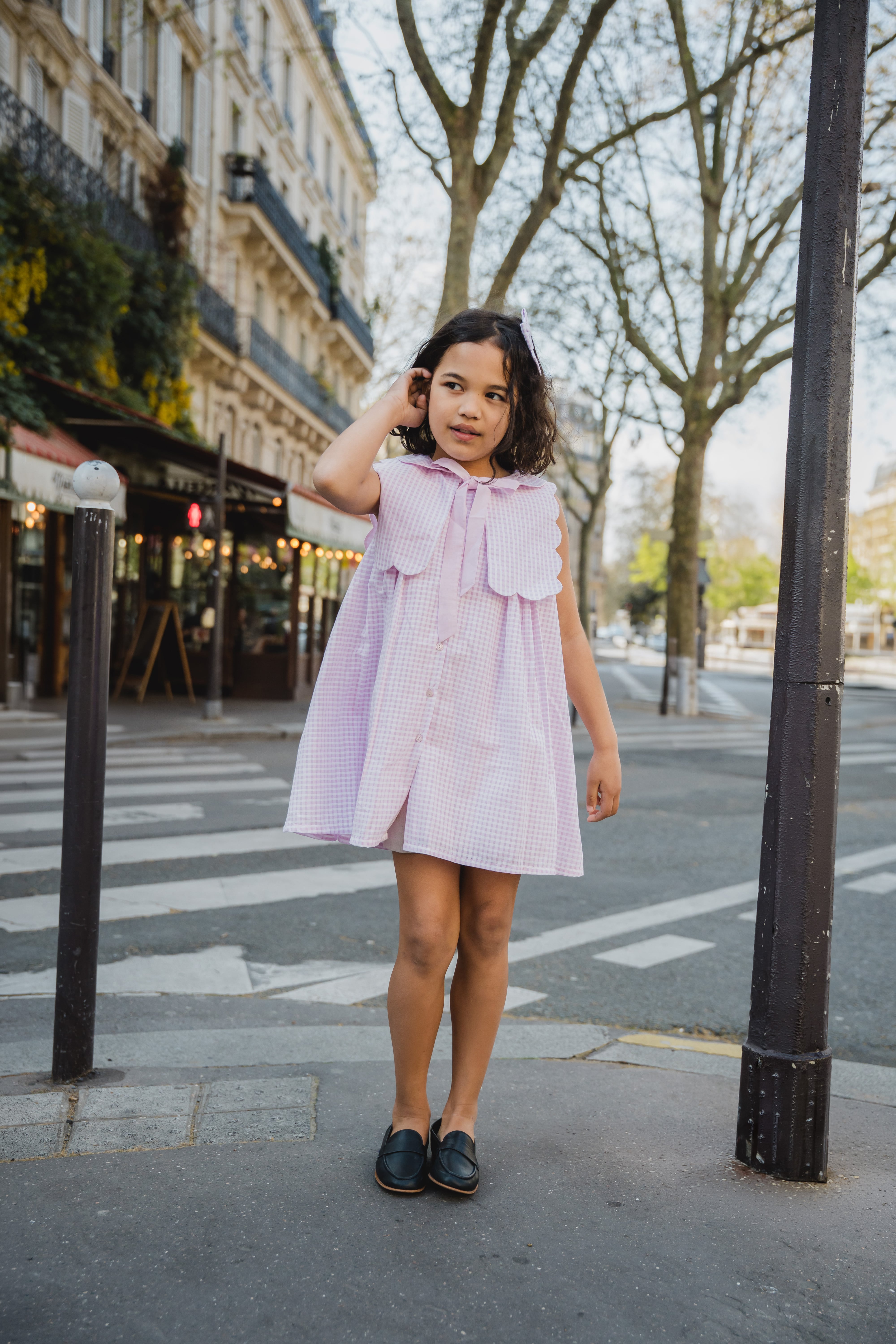 やさしいピンクのギンガムチェックが愛らしいワンピース。
