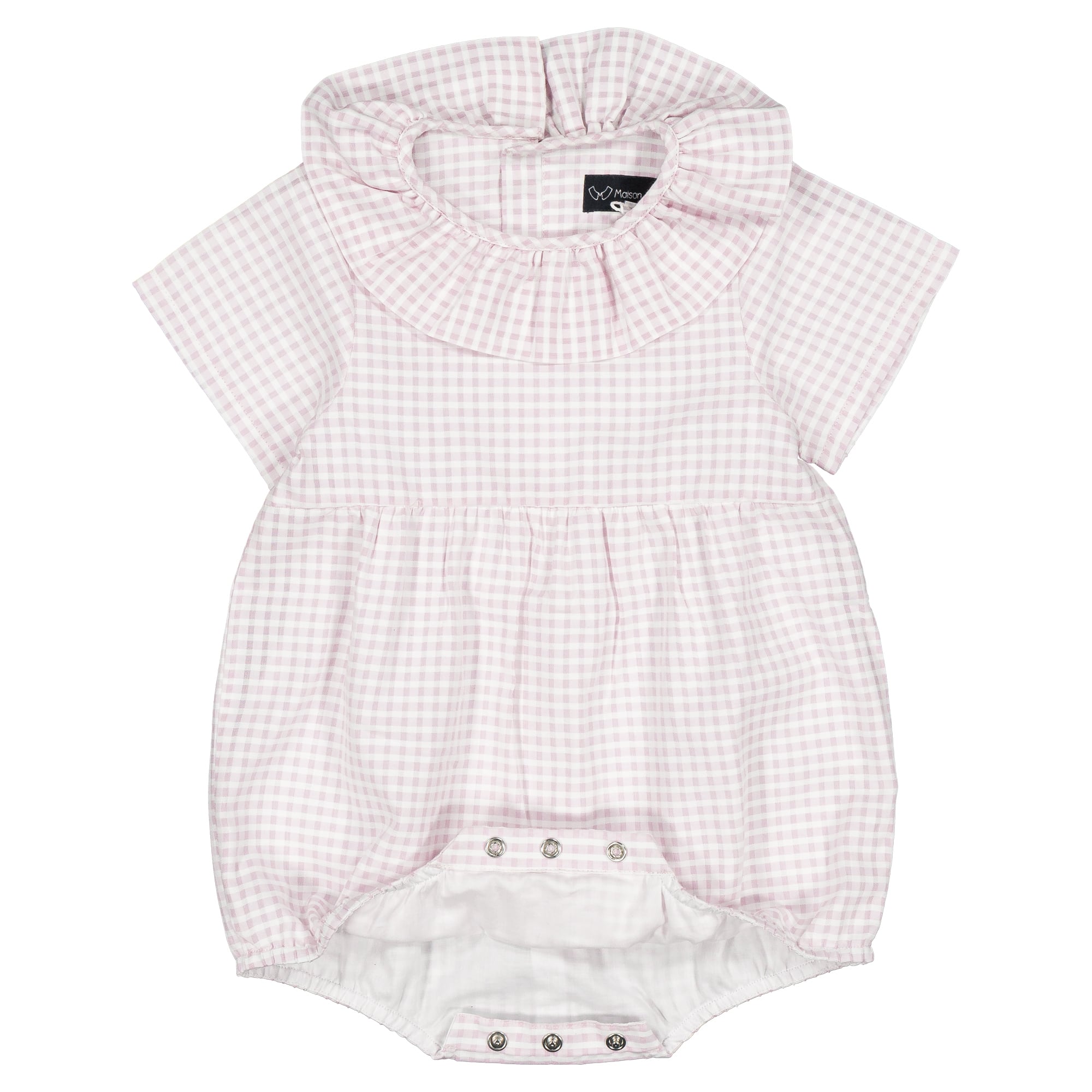 淡いピンクのギンガムチェックが可愛らしいロンパース。
