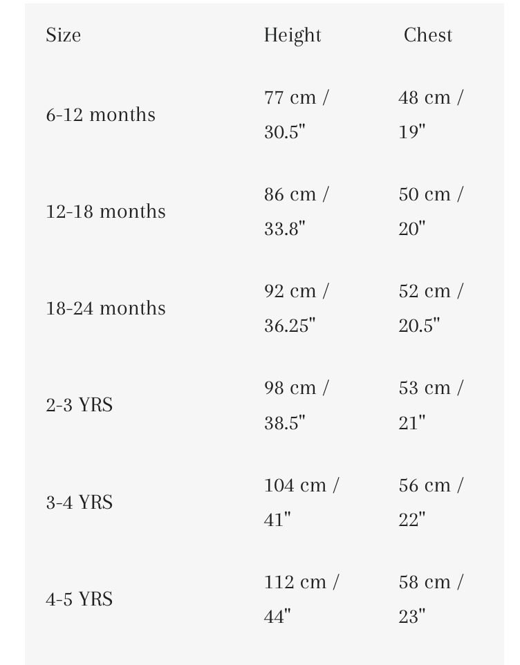 12-18m / 18-24m / 2-3y / 3-4y / 4-5y / 5-6y / 6-7y / 7-8y