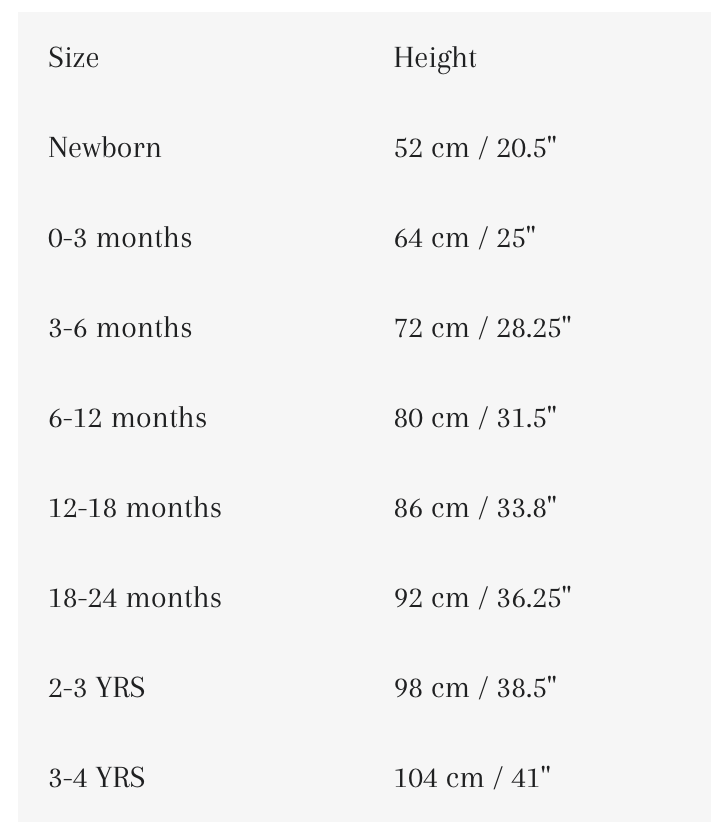 Newborn / 0-3m / 3-6m / 6-12m / 12-18m / 18-24m / 2-3y / 3-4y