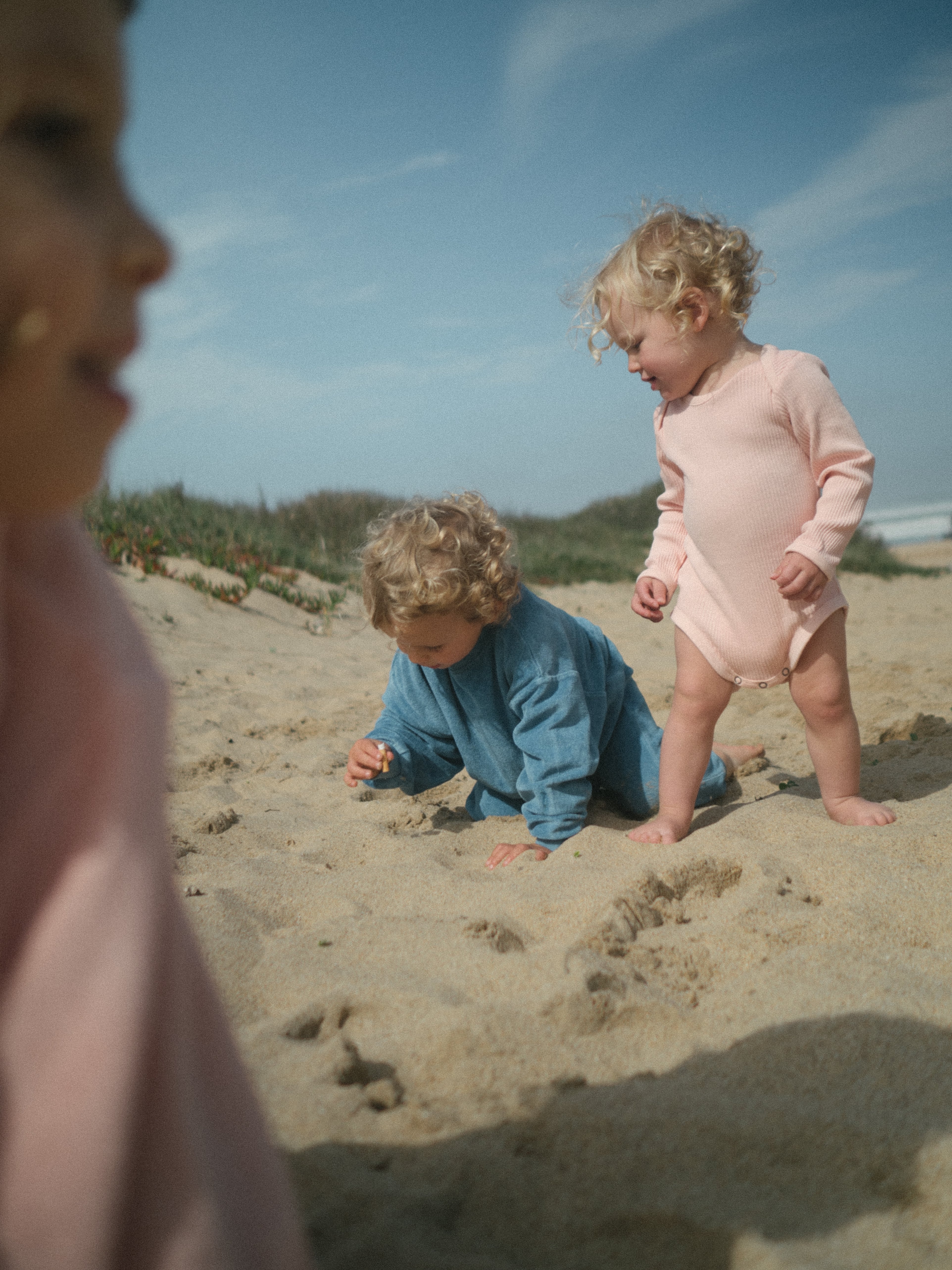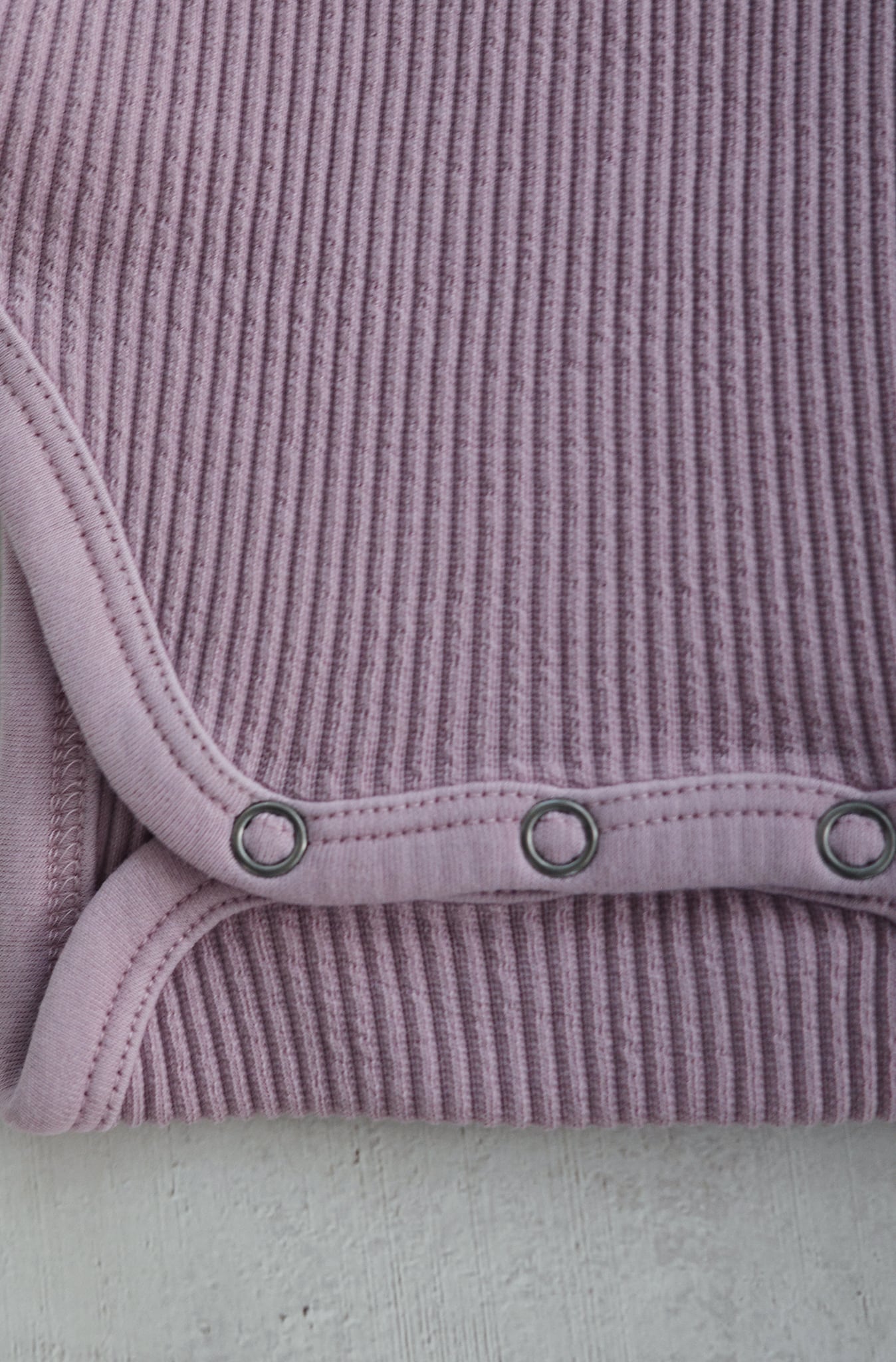 着脱しやすい、広めの長袖リップルネック(エンベロープネック)のベビースーツです。