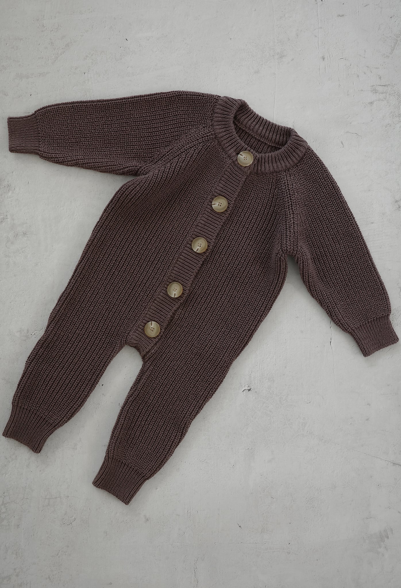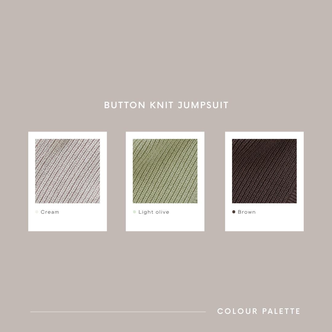 大きなボタンがアクセントになった、ラウンドネックのニットジャンプスーツ。